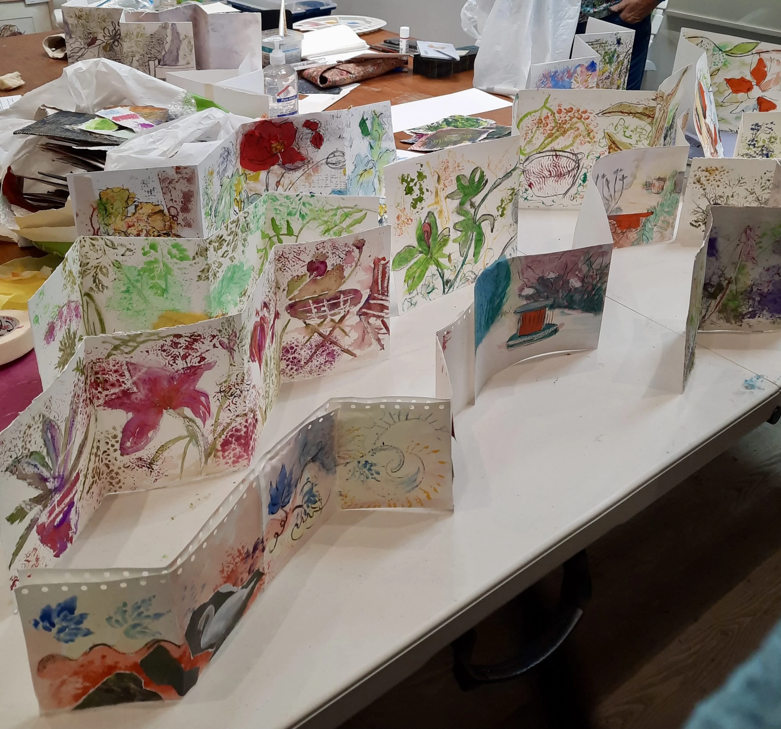 If you are daunted by starting work on large, clean, white pieces of paper, this workshop will help to overcome that hesitation. Working on a smaller scale with a handmade concertina sketchbook offers a new way of presenting your By ‘messing it up a bit’ with random areas of colour or mark making, then working back into it with mixed media, the process can be very liberating. This is a format favoured by many working artists.
